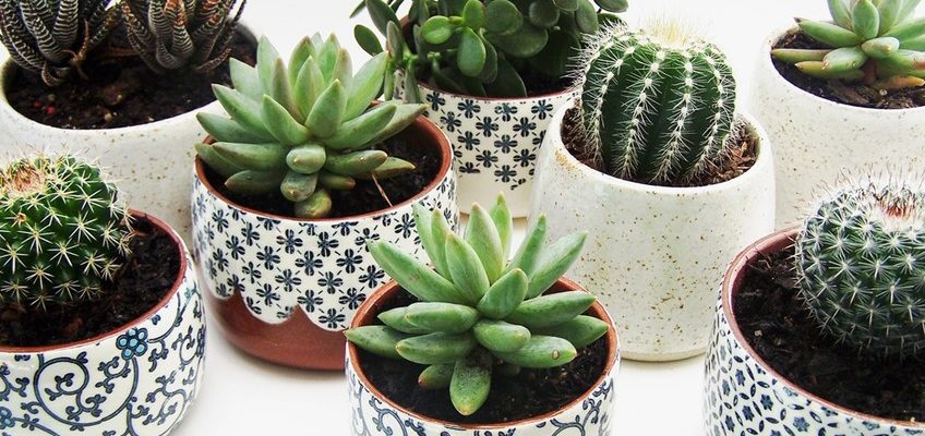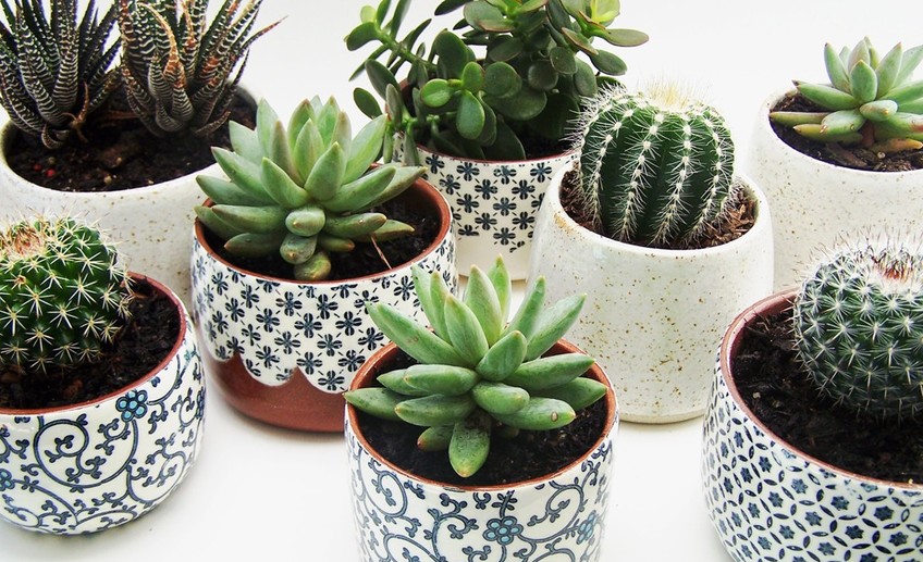 - Маленькие кактусы и эхеверии в декоративных контейнерах