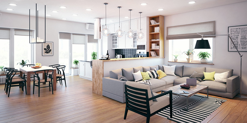 Освещение играет важнейшую роль. Лучше использовать комбинацию потолочных светильников‚ настольных ламп и напольных торшеров‚ чтобы создать мягкий свет‚ равномерно наполняющий комнату. Световые приборы в стиле лофт или минимализм отлично вписываются в такие интерьеры.